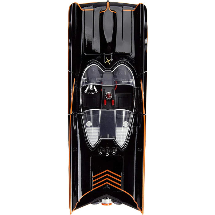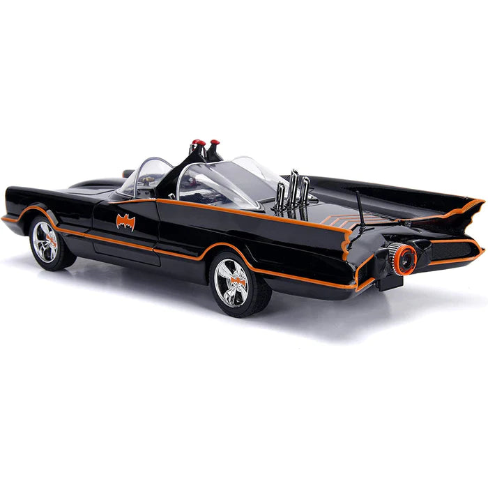Characteristics: Featuring a high quality die-cast metal body, rubber tires, and light-up features, this 1:18 scale vehicle is a detailed and accurate replica of the iconic Batmobile from the 1966 Batman TV show! Also includes die-cast Batman and Robin figurines. Door, hood and trunk open, and headlights, taillights and siren light up. Collector box packaging.