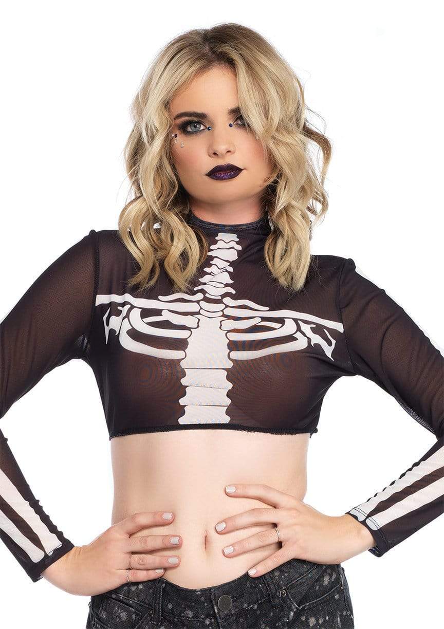 Spooky, sexy, sultry -- the Skeleton Long Sleeved Mesh Crop Top by Leg Avenue is all of those things! Form-fitting and long sleeved, it perfectly accentuates your curves and is the perfect addition to any women's Halloween costume! This sexy crop top can be paired with jeans for an easy Halloween costume look or with your favorite Leg Avenue accessories for an modern and chic DIY costume. A jaw-dropping Halloween shirt with a fashion vibe!