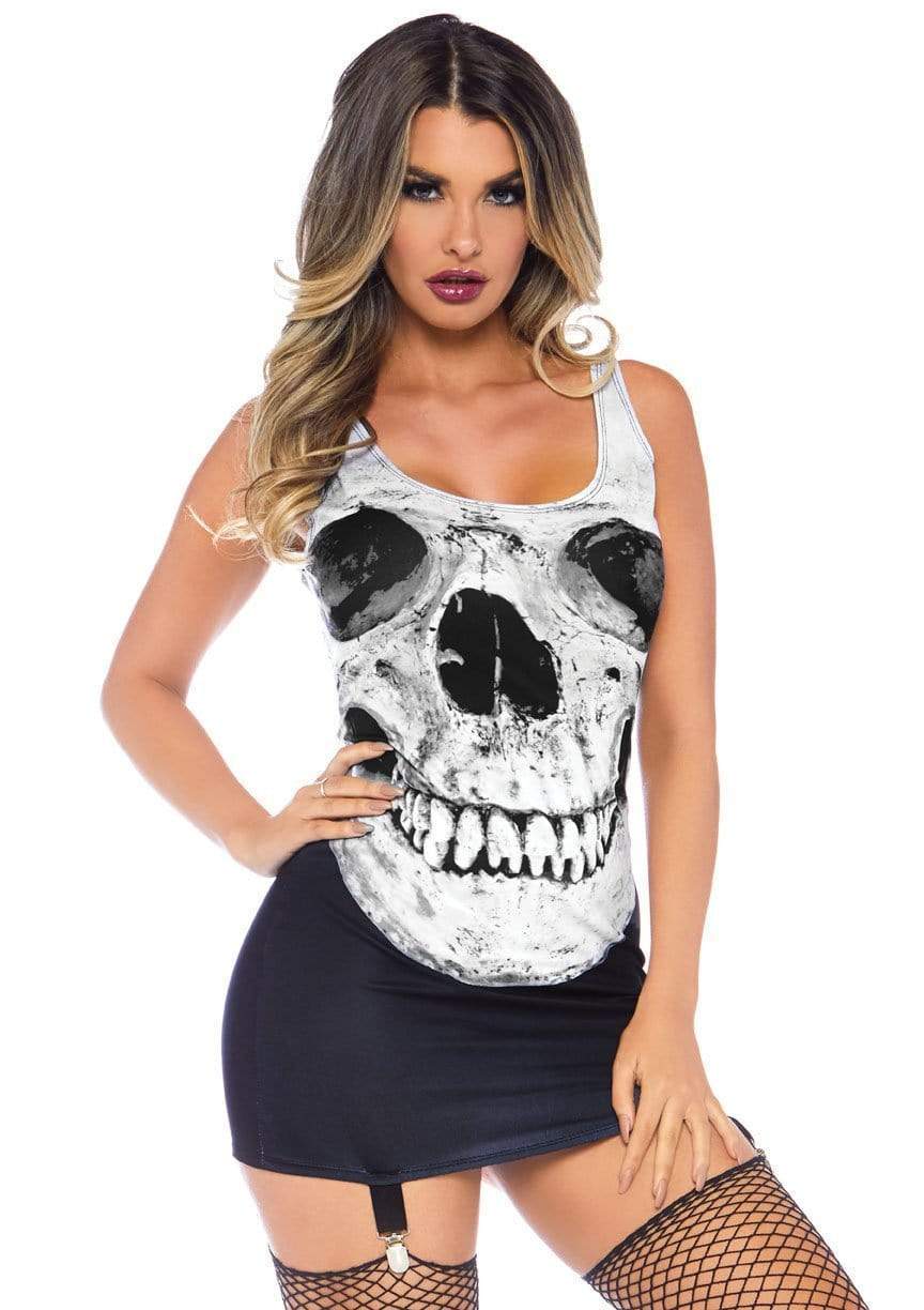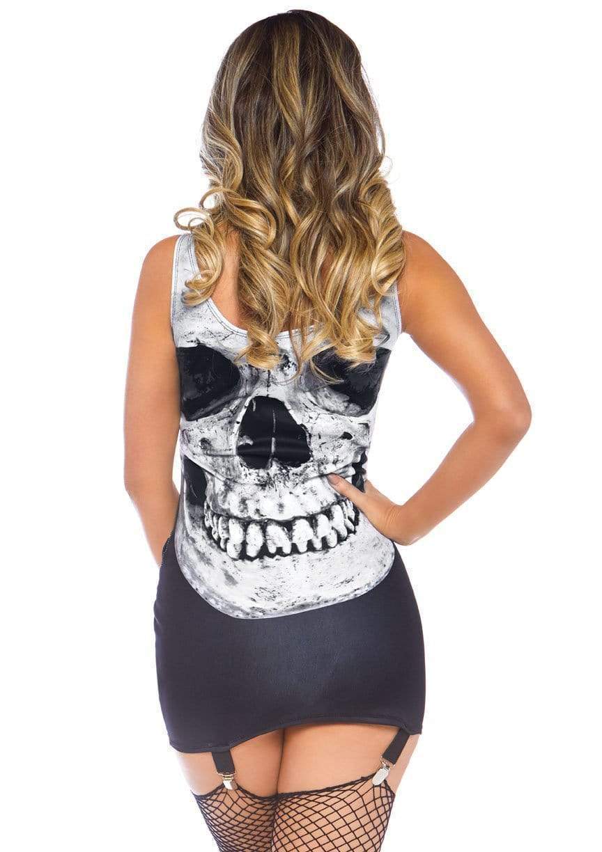 You’ll be the sexiest skeleton in the graveyard in the seductive Leg Avenue Skeleton Skull Garter Dress. This costume-ready mini dress features a front and back skull print, elastic garter suspender clips and tank top sleeves. Made to flatter almost any body type, this sexy skeleton dress is made from a soft, stretchy fabric for a curve-hugging bodycon fit.