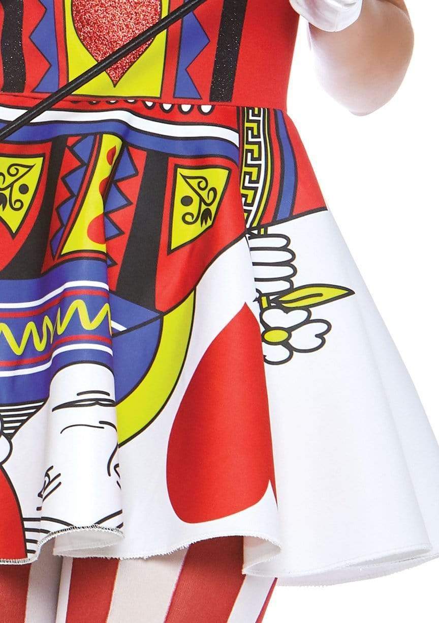 Your royal beauty will reign supreme in this stunning 3 PC Card Queen womens costume by Leg Avenue. This cute Halloween costume features a photo realistic card suit dress with glitter heart accents and an oversized card print skirt, neck piece, and a matching Queen of Hearts crown. (Gloves and crop not included)
