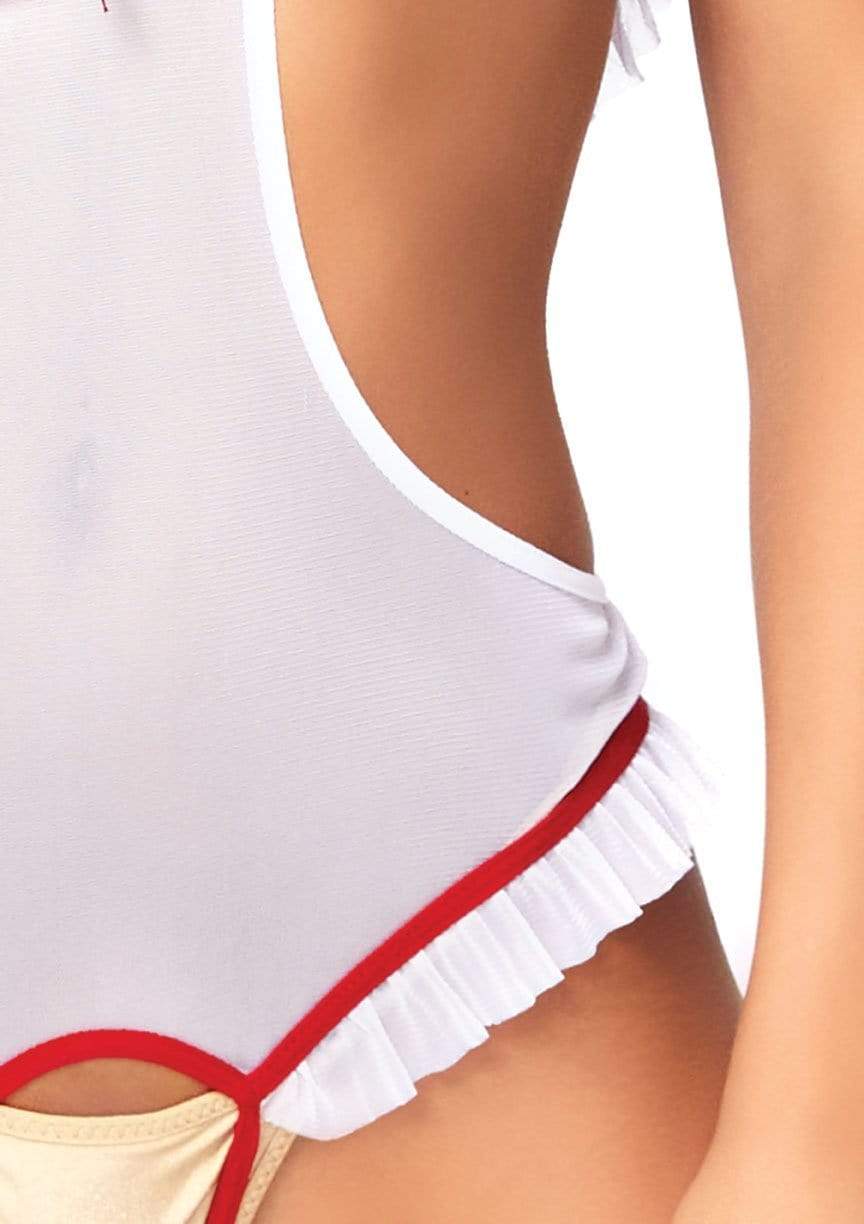 Get temps rising in the 2 PC naughty nurse roleplay lingerie set by Leg Avenue, featuring a crotchless lingerie teddy with peek-a-boo cups, cross badge accents, halter neckline, and matching hat headband. (Syringe and panty not included)