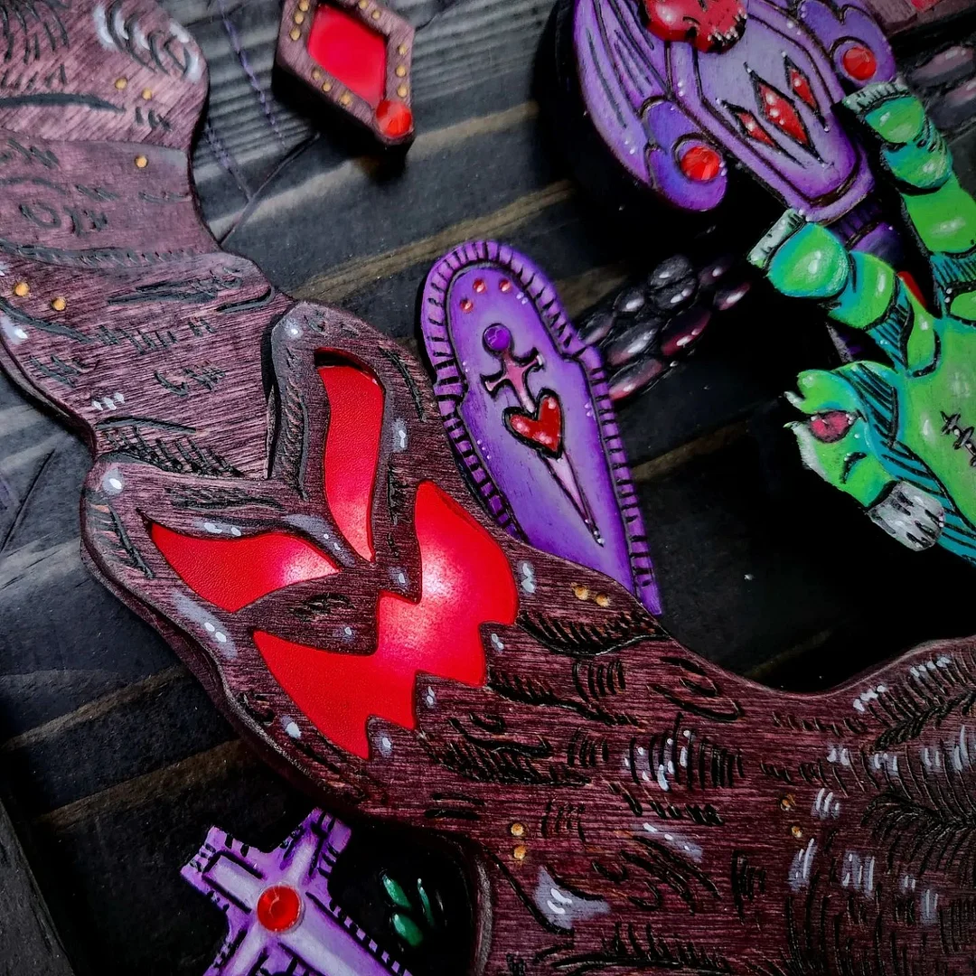 The Castle Dracula Hidden Key Box is made from high quality pine wood, the wood is polished, stained and hand painted with acrylic, gouache and metallic paints. All materials are coated with a clear protective coating to seal the wood and paint.