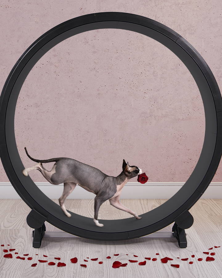 There have been more and more tests showing that cats kept inside can become bored and develop cat depression and other psychological problems. These issues can present themselves in many ways such as destroying furniture or not using litter boxes. In field testing our cat wheel has proven to not only enhance the physical well-being of our cats but altered their disposition to be more relaxed and calm.
