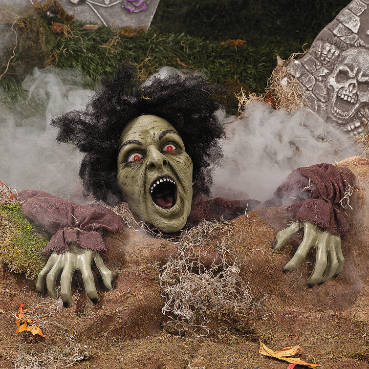 On the hunt for Halloween zombie decorations? Make your Halloween party come to life with this Clawing Zombie Groundbreaker with LED Eyes! This undead animated Halloween decoration appears to be breaking through the ground to join the living for some spooky fun! Set your Halloween scene or add it to your haunted house for a frightful look! This zombie laughs as its eyes flash red. Latex and fabric. Requires 2 AA batteries, not included. Not motion-activated. 10" x 25"
