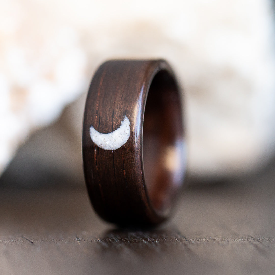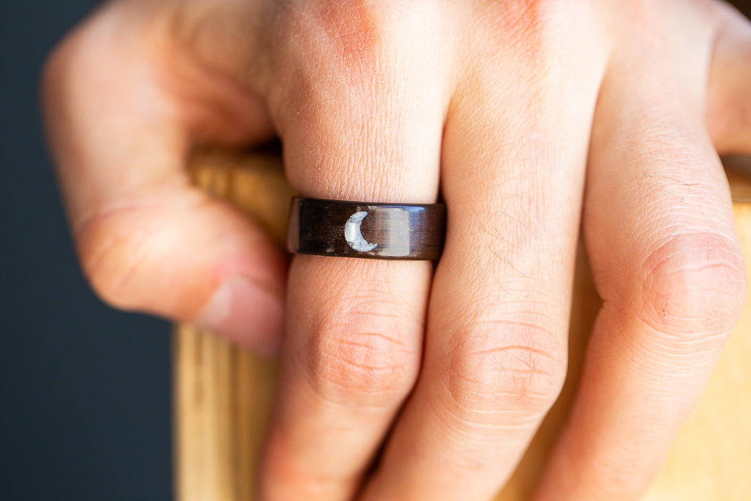 This dreamy crescent moon ring is crafted with Macassar Ebony wood, one of the strongest wood species. It’s deep near-black color is soft and smooth in its grain, and it gives an amazing contrast for the inlaid design to pop!