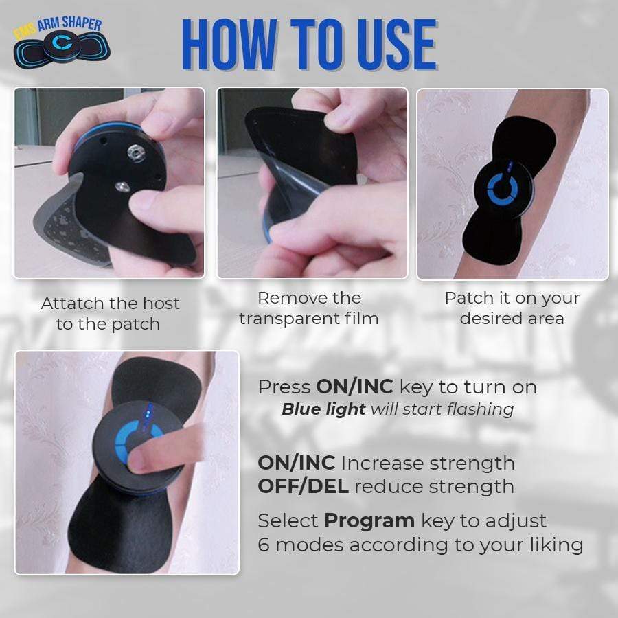 Stick the arm pads in a loop around your entire arm and adjust to your favourite intensity level out of 6.