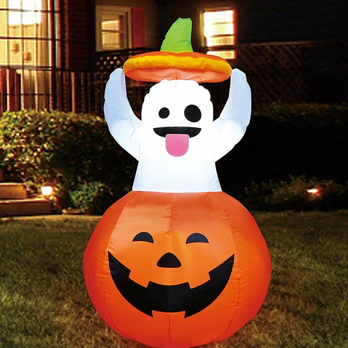 • Tall spooky inflatable Halloween ghost in pumpkin. Goofy spooky convenient Halloween holiday yard decoration.