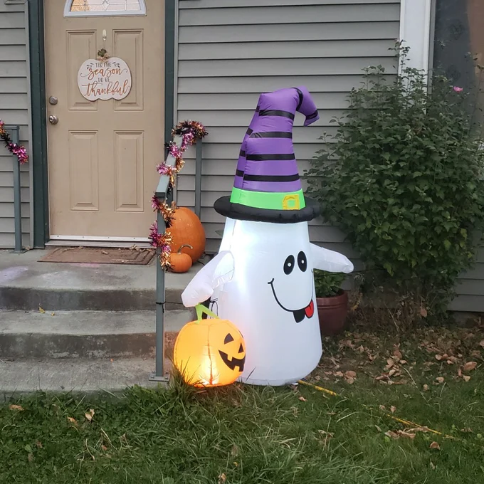 Excellent festival decoration & quick inflation & holiday accent & low noise. 1 x inflatable yard decor. 1 x storage bag, 1 x manual instruction, 4 x ground stakes, 2 x ropes.