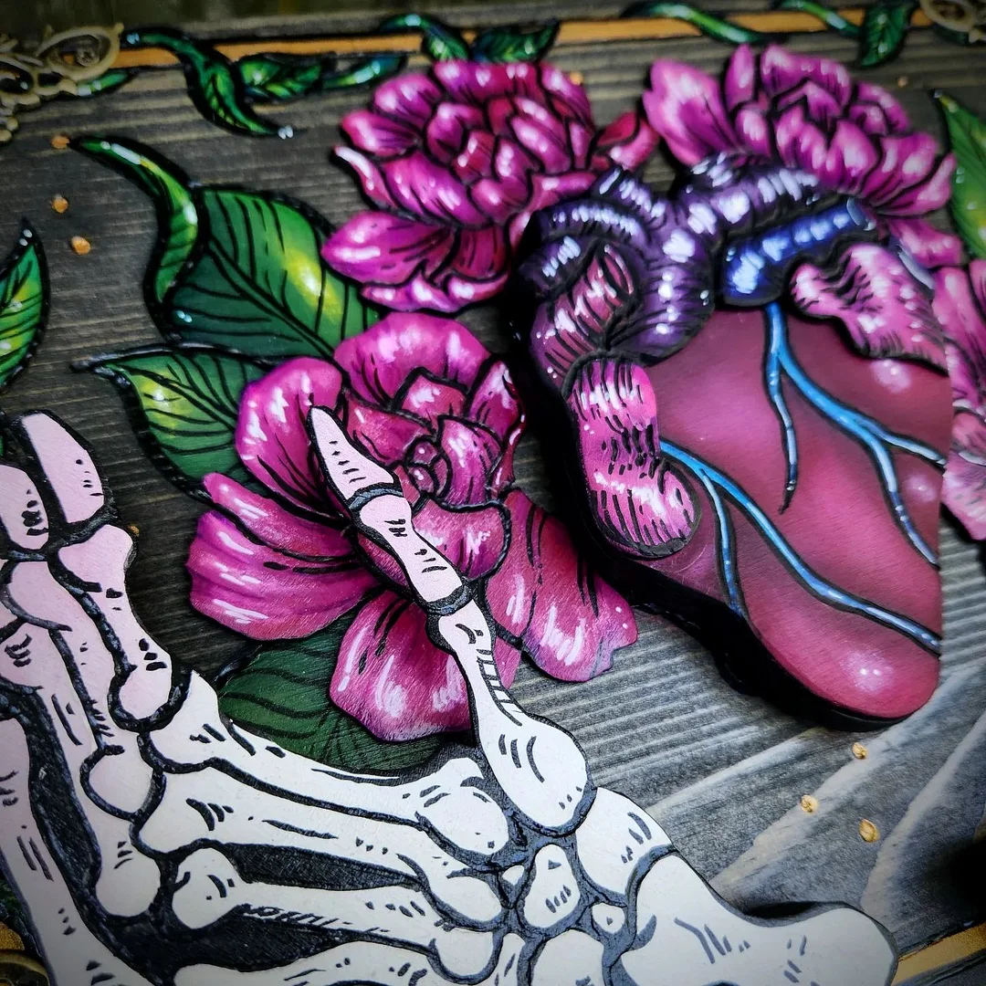 Hand-carved, this key box features a unique skeleton hand holding a blood-red heart, surrounded by flowers, greenery and other natural elements that add a touch of mystery to its appearance. The heart in the skull hands is not just a decorative object, it contains the secret key to a treasure chest waiting to be deciphered by a warrior!