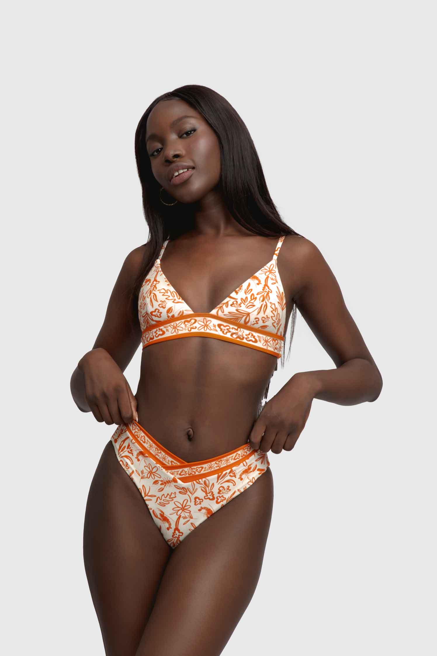 Flattering, timeless, and modern – the Julia top is the classic triangle top redefined. Features a simple triangle cut for a sleek silhouette, paired with adjustable straps and a thick band to keep everything in place. Best paired with the Valentina bottoms for an elegant summer look.