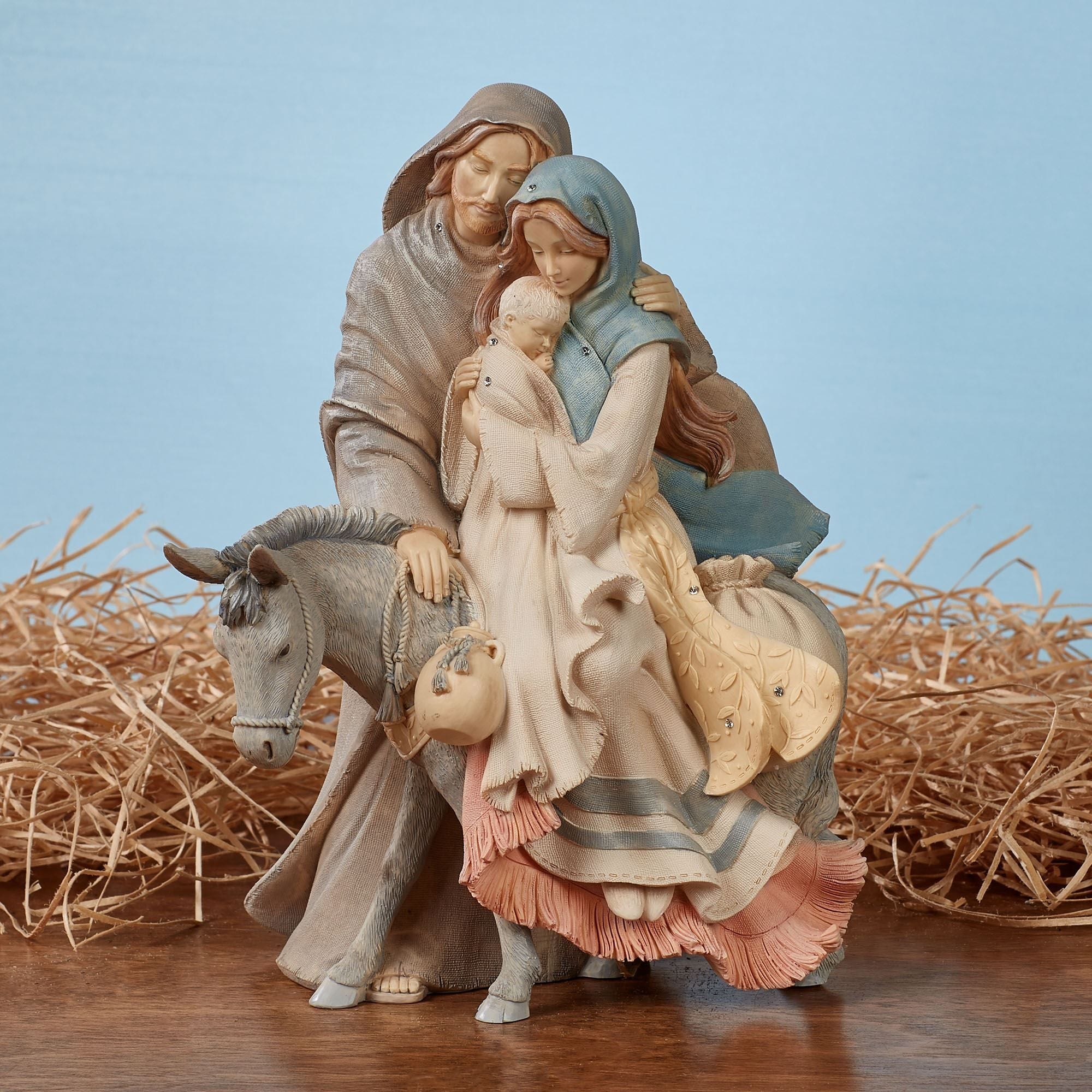 • 2017 introduction • From the Foundations(R) Collection • By Enesco(R) • Designed by artist Karen Hahn • Features the Holy Family traveling on a donkey • Touching figurine warms your heart • Has a 15th anniversary stamp and crystal accents • Soft and neutral colors