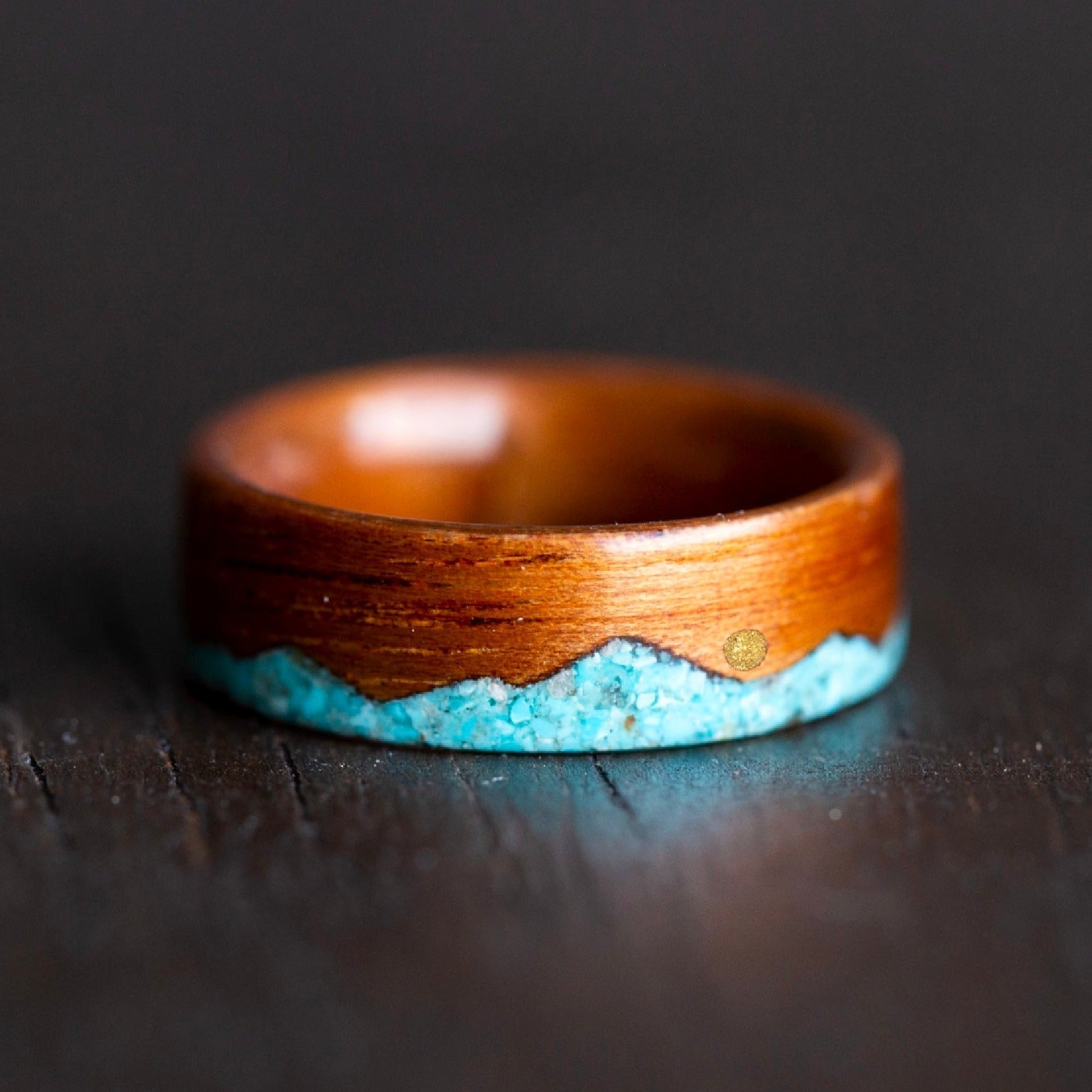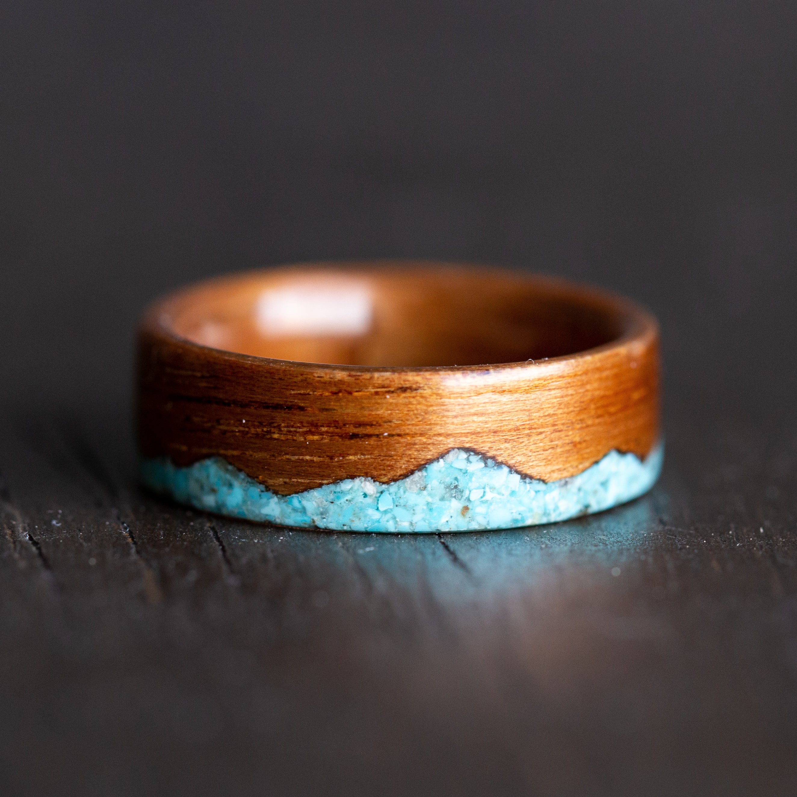 Mountains symbolize constancy, firmness and stillness. The long and sometimes arduous journey of life can have rough terrain. It's not for the faint of heart, that's why we chose to inlay this piece with campitos turquoise, as an ode to the brave.