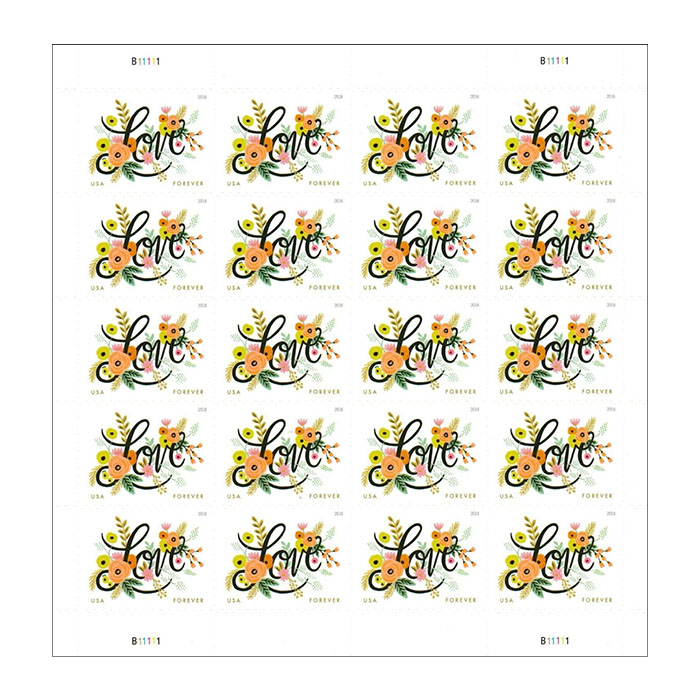 Love Flourishes is the latest stamp in the popular Love series, which began 45 years ago. The stamp art features a fanciful garden of colorful flowers surrounding the word “Love” written in cursive script.