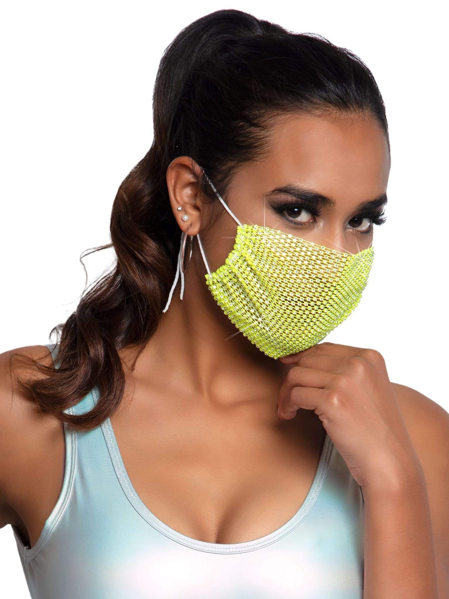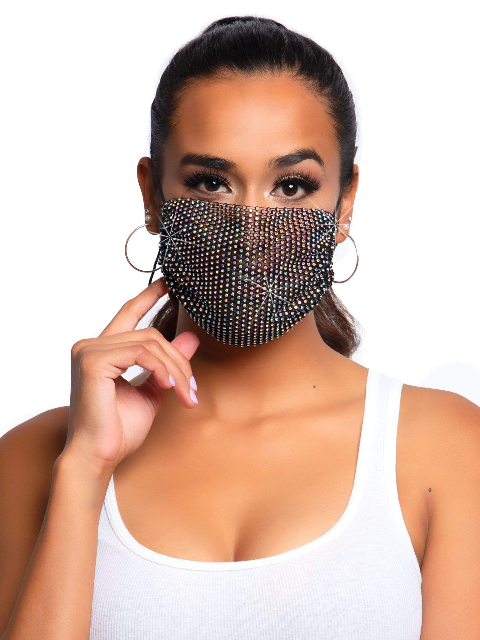 Stand out in the crowd with this gorgeous fashionable face mask, featuring iridescent rhinestones for an unforgettable look at the club, festival, rave, or paired with everyday looks.